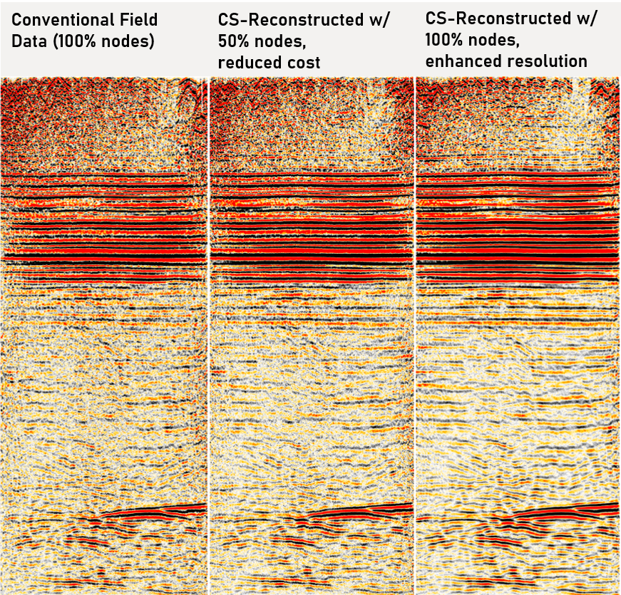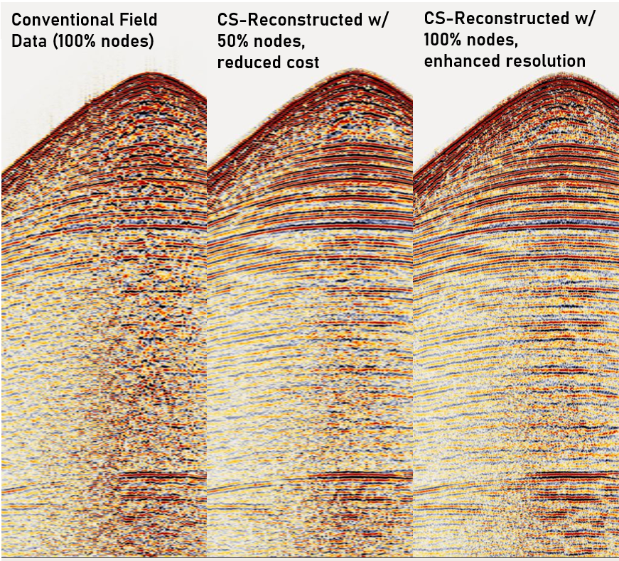 Compressive Sensing (CS) is a modern approach to efficiently collecting seismic data in the field, capable of reducing the number of sources and receivers needed to acquire high-quality data OR enhancing the data with no additional sources/receivers.